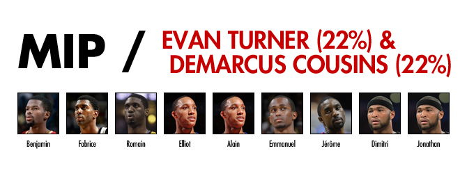 Aucun joueur ne se distingue vraiment et il est vrai qu’il est très difficile de prévoir quel joueur va exploser. DeMarcus Cousins, déjà auteur d’une bonne saison l’an passé, paraît avoir le profil idéal. Evan Turner, qui devrait avoir de nouvelles responsabilités avec le départ d’Andre Iguodala, paraît également susceptible de remporter le trophée.