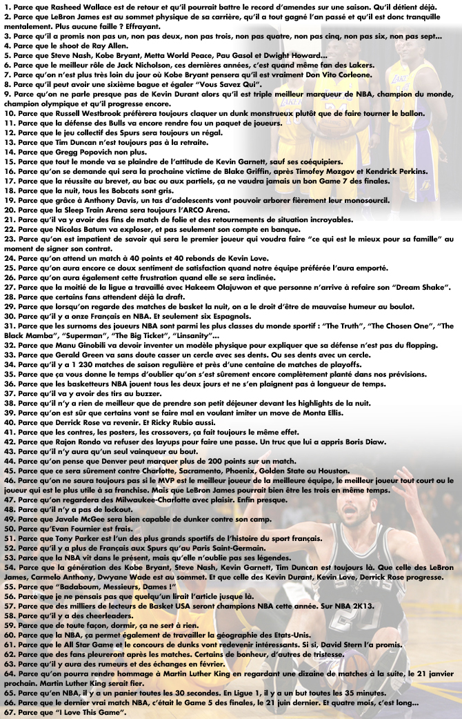 Aujourd’hui s’ouvre la 67e saison de l’histoire de la NBA. Après le lockout de l’an dernier, on retrouve finalement un calendrier complet et des équipes préparées. LeBron James est enfin champion NBA, Dwight Howard est désormais chez les Lakers, Steve Nash aussi et tous les ingrédients sont là pour nous offrir une grande saison.