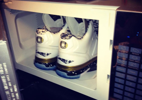 Le joueur du Heat a présenté sur Instagram la version aux accents dorés qui célèbre ses deux sacres et qu’il portera probablement contre Boston. Toujours original, Wade a dévoilé ces chaussures qui se trouvaient… dans son micro-ondes.