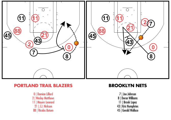 Brooklyn a profité du manque d’attention et d’habitude du rookie, qui découvre ces leurres. L’équipe décide de remettre ça sur l’action suivante mais, cette fois-ci, Damian Lillard suit mieux et ne laisse pas de tir ouvert. Deron Williams appelle alors le pick-and-roll et le meneur laisse là trop de champ à son adversaire.