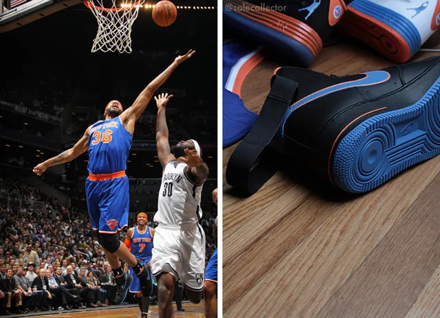 Du cuir, quelques touches oranges et bleues et cette longue sangle au talon qu'il a toujours porté. Voici donc sa “player edition” Knicks pour les matches à l'extérieur.