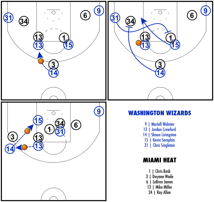 Le meneur sert Crawford puis vient poser un écran pour Chris Singleton, qui coupe alors vers le cercle. Le but n’est toutefois pas de servir l’ailier qui vient poser un écran dans la raquette sur Chris Bosh. Kevin Séraphin peut alors foncer poste bas et recevoir le ballon après un transit par Shaun Livingston.