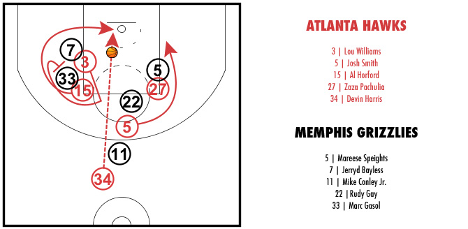 Jeff Teague remonte ainsi le ballon. Zaza Pachulia, Al Horford et Lou Williams sont tous en tête de raquette, Josh Smith y arrive. Lou Williams fait alors le tour d’Al Horford comme s’il voulait en profiter pour se libérer du marquage de Jerryd Bayless pour obtenir une position de tir.