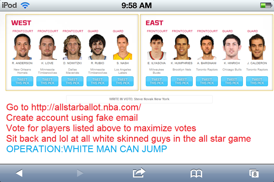 D’après The Daily Bot, les utilisateurs de 4chan ont lancé l’opération “White Men Can Jump” pour élire dix joueurs blancs comme titulaires au All Star Game, qui aura lieu le 17 février prochain à Houston.