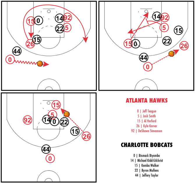Le système est joué sans véritable changement de rythme, presque tranquillement. Le démarquage de Kyle Korver fait sortir Byron Mullens, qui anticipe trop, alors que le déplacement de DeShawn Stevenson couplé à l’écran de Josh Smith permettent à Al Horford de se retrouver seul sous le cercle.