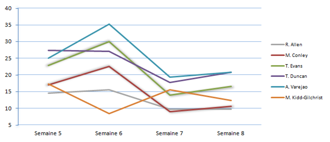 | Pivot | T. Duncan | A l’instar de Varejao, Dream Tim nous fait une “petite” semaine fantasy. Même si ses 20 points d’évaluation de moyenne sur 4 matchs sont excellents pour cet intérieur qui ne semble pas vieillir, on est loin de ses 25 points de moyenne sur la saison. |