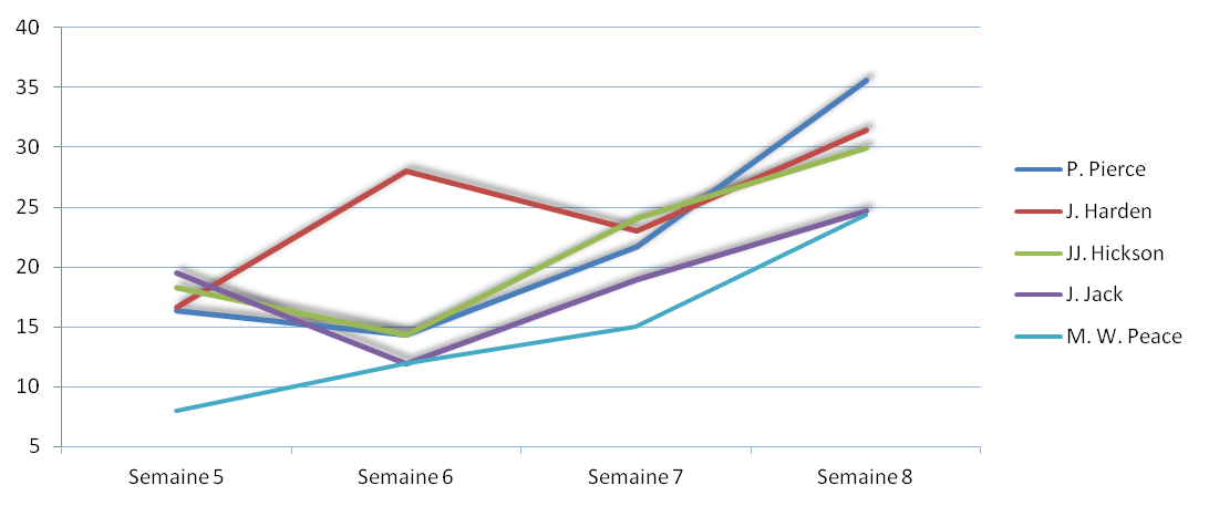 | 6e Homme | Jo. Crawford | On pensait vu ses 21 points de moyenne la semaine dernière que Crawford avait enfin pris la mesure de son rôle dans le banc quasi désertique de Washington, le soufflet ne tient pas et il retombe à 10 points fantasy sur la semaine. |