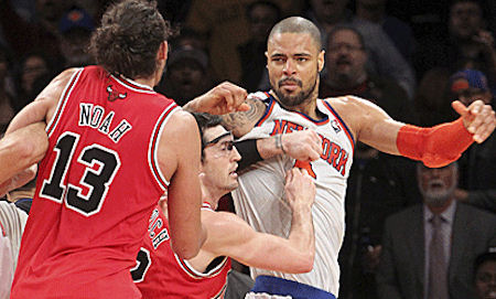 Carmelo Anthony d’abord, victime d’un coup d’épaule non sifflé sur un écran mobile de Joakim Noah. Melo se faisait ensuite justice sur le Français en le frappant à l’avant-bras sur une position au rebond avant de sortir pour sa 2e faute technique de la soirée. A trop reprocher aux arbitres de ne siffler que d’un côté, Mike Woodson rejoignait à son tour les vestiaires pour une 2e technique, pendant que ses Knicks pointaient à 78-95 à 5 minutes du terme. Et pour conclure, Tyson Chandler, encore sur Jooks, bien décidé à envoyer les coudes pour prendre la position au rebond, puis à en découdre en provoquant le pivot français qui venait de lever la main pour tenter de calmer les esprits. S’en déclenchait un début d’explication musclée qui, au final, renvoyait les deux pivots à la douche.