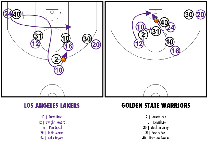 Mike D’Antoni appelle alors un temps mort et relance Pau Gasol. Avec Dwight Howard, l’Espagnol se place poste haut alors que Kobe Bryant et Jodie Meeks sont dans les corners. Steve Nash le sert et va poser un écran, pas très licite, sur Stephen Curry. Pau Gasol sert alors Jodie Meeks qui a coupé ligne de fond.