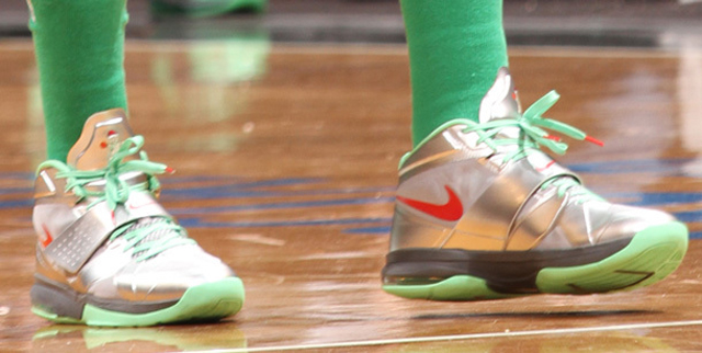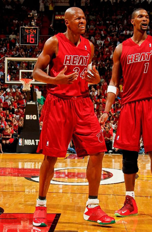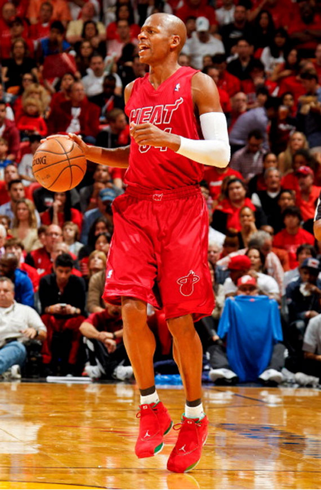 Grand habitué des rétros Jordan personnalisées, Ray Allen a encore frappé fort en sortant une XVIII et une XX aux couleurs de Noël pendant la victoire contre le Thunder. Un match au cours duquel Russell Westbrook a quant à lui joué la modernité avec un nouveau coloris de la toute dernière de Jordan Brand, la XX8. Le côté “tranches de saumon” bleues étalées collait bien à l’esprit de la fête.
