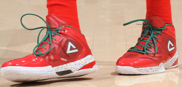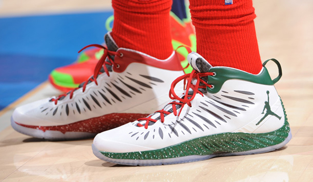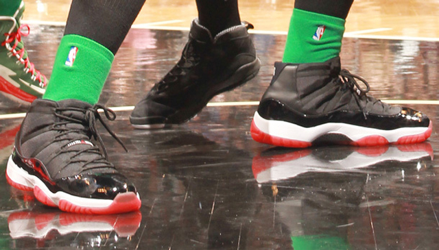 Chris Bosh et Rajon Rondo ont fait un peu moins original mais toujours très Noël. Les deux joueurs ont opté pour des Hyperposite personnalisées. Blake Griffin a lui bénéficié d’une Jordan Super Fly dans la lignée des modèles simples de la marque pour Noël. Paul Pierce a opté pour l’argent. Ronny Turiaf est passé chez Peak. Enfin, Jared Sullinger a suivi notre conseil cadeau en sortant avec une paire de Jordan XI “playoffs” aux pieds.