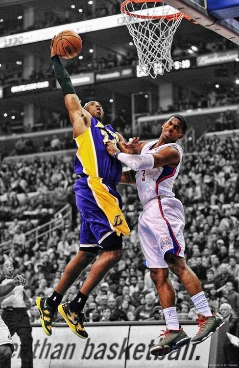 C’est à coup sûr un dunk que l’on reverra des dizaines de fois ce week-end. Kobe Bryant intercepte un ballon, et s’en va en contre-attaque. Chris Paul ne lâche rien et tente de le contrer.
