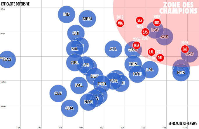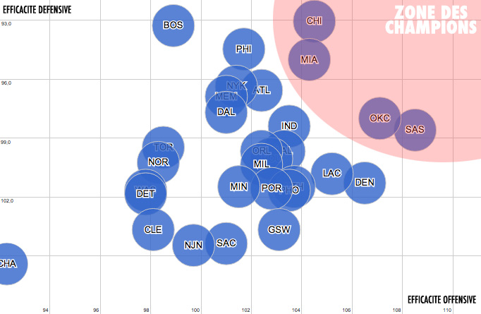En couplant l’efficacité offensive (le nombre de points inscrits sur 100 possessions) à l’efficacité défensive (le nombre de points encaissés sur 100 possessions), on obtient ainsi une projection de l’efficacité globale d’une équipe (les meilleures se trouvant dans le coin haut droit). En toute logique, les équipes qui cumulent une bonne efficacité défensive et offensive sont celles qui ont le plus de chances de remporter le titre.