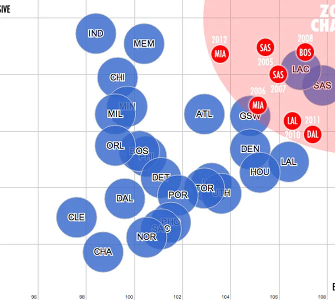 En couplant l'efficacité offensive (le nombre de points inscrits sur 100 possessions) à l'efficacité défensive (le nombre de points encaissés sur 100 possessions), on obtient ainsi une projection de l'efficacité globale d'une équipe (les meilleures se trouvant dans le coin haut droit). En toute logique, les équipes qui cumulent une bonne efficacité défensive et offensive sont celles qui ont le plus de chances de remporter le titre.