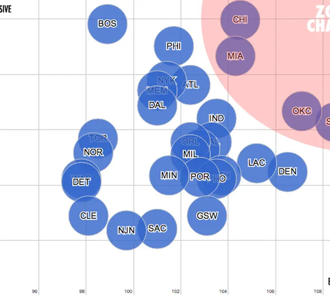 Autres détails importants : Chicago est sorti de cette zone parce que l'équipe a beaucoup régressé offensivement, la faute évidemment à la blessure de Derrick Rose. Boston et Dallas sont dans le ventre mou alors que la progression, notamment défensive, des Warriors, est spectaculaire.