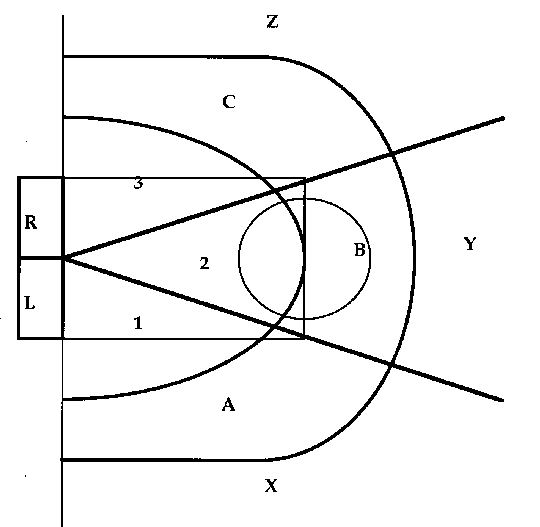 Voici les emplacements qu’il faut retenir. Le diagramme manque en fait un emplacement et il s’agit du dunk, un D entre le R et le L qui indiquent des lay-ups (a gauche et a droite du panier) sur la gauche du dessin. Les positions 1, 2 et 3 indiquent des tirs pris pres du panier. Et ne venez pas me demander quoi faire si le joueur prend un tir a l’intersection des zones 2, 3, B et C !!!