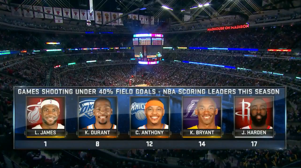 Réponse en image et sans appel : 8 fois pour Kevin Durant, 12 pour Carmelo Anthony, 14 pour Kobe Bryant et 17 pour James Harden.
