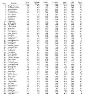 Ainsi, les deux chercheurs de Harvard ont étudié l'adresse adverse près du cercle (Close FG%) lorsque le défenseur est à moins d'1m50 du panier. Dans ce cas, c'est Roy Hibbert qui est le plus efficace puisque les adversaires ne tirent qu'à 38.2% lorsqu'il se dresse face à eux. Larry Sanders est deuxième (38.4%), Serge Ibaka quatrième (41.6%) et Dwight Howard dixième (45.7%). À noter : Joakim Noah est neuvième (45.5%).