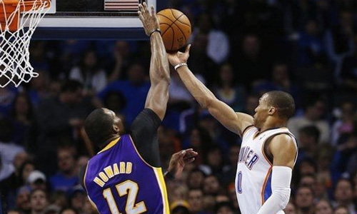 Symbole de l’intensité énorme mise en place par OKC : Serge Ibaka vient contrer une tentative de dunk de Dwight Howard. Les Lakers accumulent les lancers-francs, la seule chose leur permettant de rester dans le match, surtout avec une telle défense (37-28).