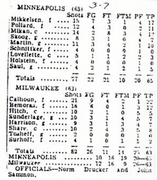 La boxscore du match entre les Milwaukee Hawks et les Minneapolis Lakers
