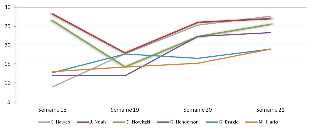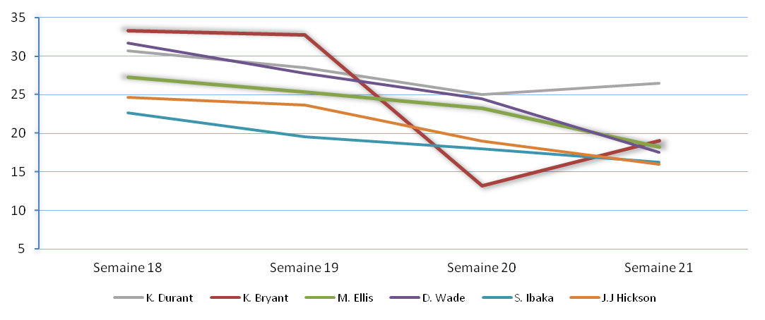 Plusieurs joueurs majeurs ont fait leur retour la semaine dernière, ne perdez donc pas de vue Bryant, P. Gasol et TP pour vos choix de la semaine. Marc Gasol est lui out. Antawn Jamison, KG et Steph Curry pourraient manquer quelques matches.