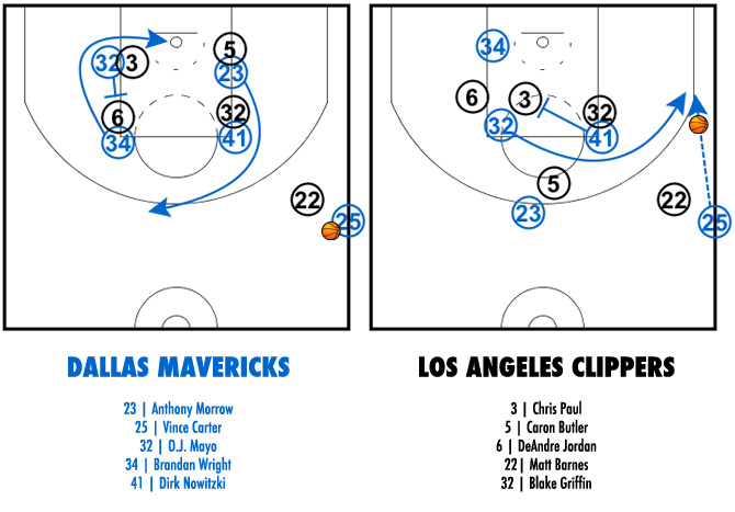 De son côté, Dirk Nowitzki est en tête de raquette. De là, il pourrait également s’offrir un bon tir. La bonne défense des Clippers a gêné la mise en place des options et n’a pas offert de tir facile à Dallas. Néanmoins, Rick Carlisle a réussi à offrir trois possibilités (alley-oop pour Brandan Wright, O.J. Mayo sur l’aile et Dirk Nowitzki poste haut) à Vince Carter, qui faisait la remise en jeu. De quoi pouvoir égaliser.