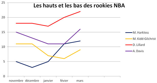 A l’inverse, Michael Kidd-Gilchrist a heurté le mur des débutants pleine poire depuis un certain temps. Ainsi, coach Dunlap ne l’a fait jouer 30 minutes et plus qu’a 3 reprises ce mois-ci alors que c’était une habitude en début de saison. Mais le rendement n’est plus le même non plus. MKG tournait à 13 points après 6 matchs ; désormais, sa moyenne a chuté à 9 points par match.