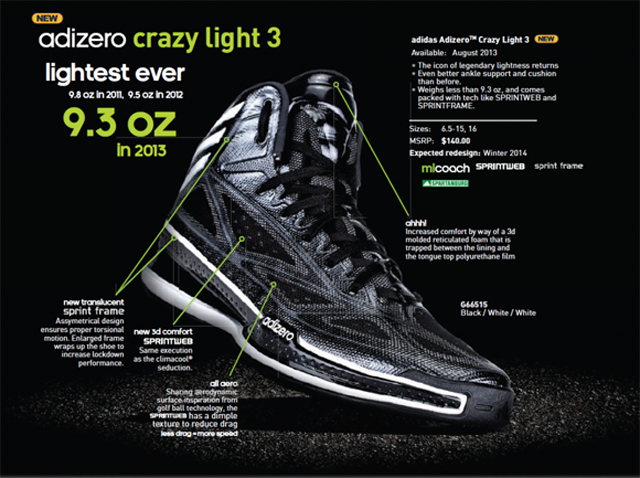 La course à la légèreté d’Adidas continue. En août 2013, la Crazy Light 3 sera encore plus légère que ses devancières. Poids annoncé : 263,6 grammes. C’est presque six grammes de moins qu’en 2012 et quasiment quinze grammes gagnés sur la Crazy Light originale. Et encore une fois, ce modèle sera le plus léger du marché.