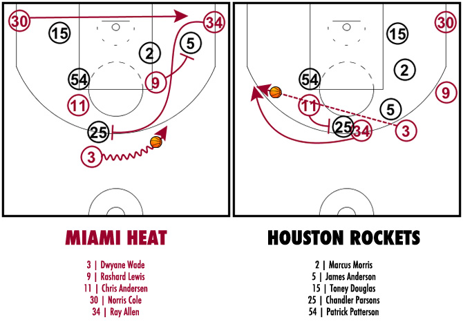 L'arrière garde le ballon en main et se décale tandis que Chris Andersen vient poser un écran sur le poseur d'écran, à savoir Ray Allen. Chandler Parsons, déséquilibré, est éloigné et le shooteur se retrouve seul.