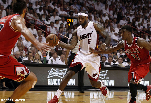 Dos au mur, le Heat abordait ce 2ème acte avec deux fois plus de pression sur ses épaules. Face à des Bulls encore diminués mais à l’état d’esprit toujours aussi guerrier, les hommes de coach Spoelstra ont rapidement mis fin au suspense. Contrairement au match précédent, King James n’a pas attendu le 3e quart afin d’afficher sa détermination. Auteur d’un parfait 6/6 au tir, souvent près du cercle, LBJ rendait une copie parfaite en première mi-temps, alors que la paire Boozer-Noah avait perdu de son impact sous les panneaux. Sur un coup de sifflet anodin, James et Noah se chauffaient une première fois et récoltaient une technique chacun. Pourtant, James semblait impassible, rivé sur son objectif, celui de remettre son équipe dans le droit chemin. Son subtil coup de coude infligé à Jooks sera son seul écart de conduite de la partie, et la seule réplique aux nombreuses provocations dont il a été l’objet. Sur le buzzer du premier quart, il apportait d’ailleurs la meilleure des réponses, se jouant de Butler et Noah avant de conclure main gauche et offrir 5 longueurs d’avance au Heat (25-20).