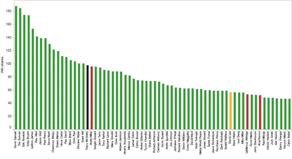 Pour cela, nos confrères ont cherché les 66 joueurs en activité avec le taux “Win Shares” le plus élevé. Celui-ci permet de mesurer l'influence d'un joueur dans sa carrière. Pour faire simple : si ce taux est élevé, cela veut dire que le joueur a gagné beaucoup de matches et qu'il a fortement contribué à ces succès.