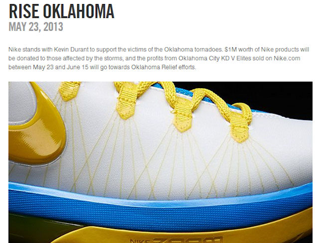 La star du Thunder a demandé à Nike de faire ce geste, et il a aussi demandé à ce que les revenus générés entre le 23 mai et le 15 juin par les ventes du modèle KD V Elite (180 dollars) soient aussi versés aux associations qui aideront les habitants de Moore.