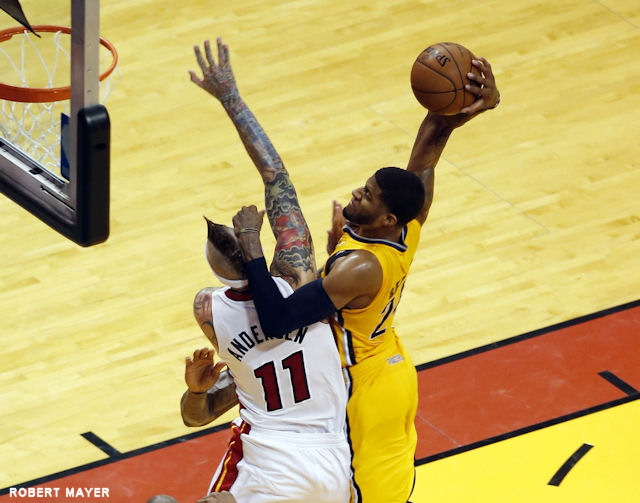 Fin du 3e quart-temps. Avant-dernière possession. Le match est somptueux, et Paul George va mettre la cerise sur le dessus du cheesecake : un tomar monstrueux sur les 2m13 (avec la crête) de Chris Andersen. On ajoute un peu de “regard qui tue”, et on a un dunk de légende !
