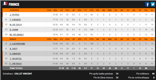 Ce match rapidement dans la poche des Bleus, avec notamment un passage génial de Boris Diaw (12 points, 4 passes) qui semble particulièrement courroucé pendant cette préparation, Vincent Collet a fait tourner son effectif. Thomas Heurtel a ainsi pu prendre feu en 4e quart avec au final, une note à 11 points et une impression agréable que le feu follet de Vitoria pourra rendre de fiers services à la nation en Slovénie.