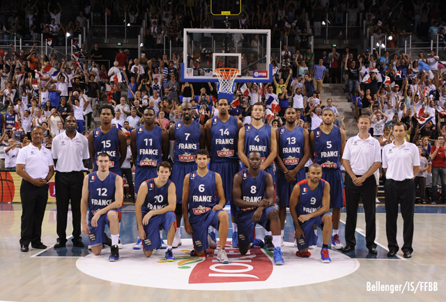 Le banc : Nando De Colo (1,95m), Antoine Diot (1,90m), Thomas Heurtel (1,87m), Charles Kahudi (1,99m), Joffrey Lauvergne (2,11m), Johan Petro (2,14m), Florent Pietrus (2,01m)