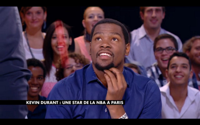 Mais la NBA n’est plus sur Canal+, et Kevin Durant a pu s’en rendre compte. Invité d’Antoine De Caunes, la star du Thunder a découvert l’humour français avec un animateur qui se met un panier sur la tête, et qui lui demande de marquer des paniers. Une version détournée du traditionnel panier que l’on place dans un studio à chaque fois qu’un basketteur est invité.
