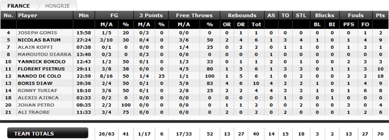 Pietrus (10 points) : Féroce en défense, comme à son habitude, il aura moins pesé en attaque qu’à Strasbourg, la faute à des Hongrois très resserrés dans la raquette et à une adresse extérieure honteuse.