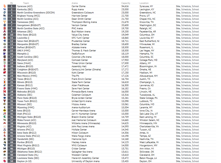 Par ailleurs, trois universités partagent leur salle avec une franchise NBA. Il s’agit de Georgetown (Verizon Center avec les Washington Wizards), Marquette (BMO Bradley Center avec les Milwaukee Bucks), et Memphis (FedEx Forum avec les Memphis Grizzlies), mais aucune ne fait partie du Top 5 des plus grandes salles de la NCAA. En tête du palmarès, on retrouve en effet l’équipe de Syracuse et son célèbre Carrier Dome, qui a également la particularité d’être le stade de l’équipe de football américain des Orange. Bien que faisant rarement le plein (le premier match joué à guichets fermés n’a eu lieu que l’an dernier lors de la venue de Georgetown pour la cérémonie du retrait du maillot de Carmelo Anthony), cette salle de près de 35 000 places accueille généralement plus de 20 000 spectateurs les soirs de matchs.