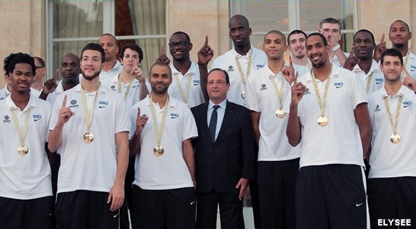 Comme cela a déjà été rétabli dans un article de Libération, le geste des Bleus sur la photo avec le Président Hollande sur les marches de l’Elysée est tout simplement le signe « Un » de l’index qui signifie le premier titre ! Comme les joueurs NBA l’ont toujours fait depuis des lustres…