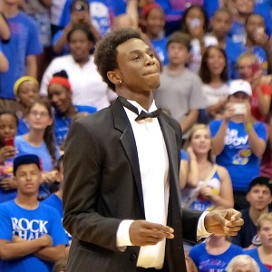 Après la présentation de toutes les équipes de Kansas, de l’athlétisme au golf en passant par le tennis, Bill Self a fait son entrée et a livré son traditionnel discours d’introduction, évoquant une classe de freshmen « que l’on peut qualifier d’au-dessus de la moyenne ». Puis ce fut au tour du comédien Rob Riggle, passé par les bancs de l’université il y a quelques années avant de partir à la conquête d’Hollywood, d’enflammer la salle en présentant quelques parodies de films tels que « The Hangover » ou « Anchorman » dont les joueurs des Jayhawks ont rejoué les scènes cultes à leur manière.