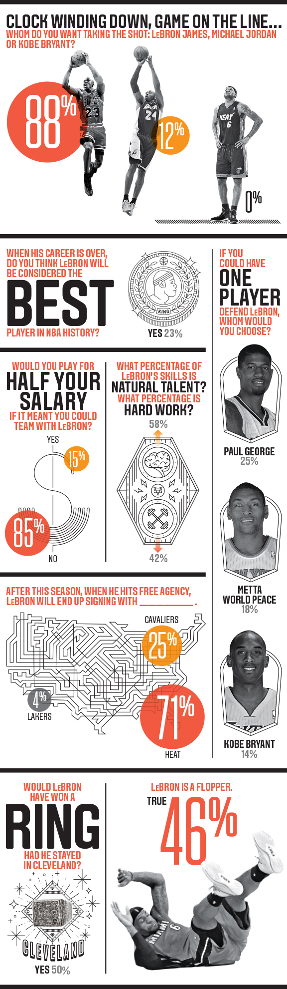 Donneraient-ils le dernier shoot à Michael Jordan, Kobe Bryant ou LeBron James ? Est-ce que LeBron James sera considéré comme le meilleur joueur de l’histoire à la fin de sa carrière ? Qui peut défendre sur lui ? Est-ce que les joueurs accepteraient de baisser leur salaire de moitié pour jouer avec lui ? Où ira-t-il en 2014 ? Aurait-il réussi à gagner un titre s’il était resté à Cleveland ? Est-il un floppeur ?