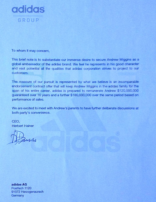Les marques n’ont en effet pas le droit de discuter avec les joueurs universitaires et doivent attendre que ceux-ci soient rentrés en NBA pour le faire. Cette lettre, qui n’est pas datée et qui fait une proposition concrète à un basketteur amateur, n’est donc absolument pas crédible.