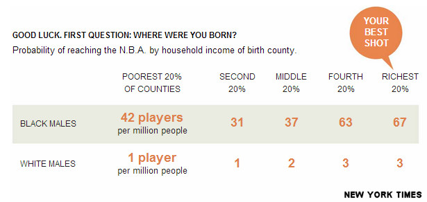 Dans un article du New York Times, Seth Stephens-Davidowitz met effectivement à mal l’idée préconçue que les joueurs NBA sont tels que Lebron James, à savoir nés dans un milieu social défavorable et, parfois même, dans une cellule familiale monoparentale. La vérité, c’est que vivre dans une famille plus aisée permet davantage d’avoir accès à une carrière en NBA.