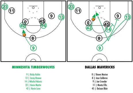 Les Mavericks changeaient sur les écrans et Corey Brewer, après le premier écran de Ricky Rubio, se retrouvait face à Jose Calderon, un défenseur lent, qui doit donc anticiper. C'est ce qu'il fait, pensant que l'ancien Nugget va ressortir à trois points alors qu'il change de direction et coupe dans la raquette.