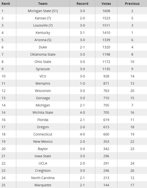 Kansas, qui a dominé Duke dans l’autre rencontre du Champions Classic, grimpe de la cinquième à la deuxième place dans le sillage de son freshman vedette Andrew Wiggins. Louisville, qui n’a pour l’instant affronter que des adversaires de seconde zone, reste sur la troisième march du podium. Kentucky recule de trois places et se classe quatrième, mais la performance des Wildcats en deuxième période face à Michigan State a été très prometteuse. Arizona grimpe au cinquième rang suite à sa belle victoire remportée sur le parquet de San Diego State.