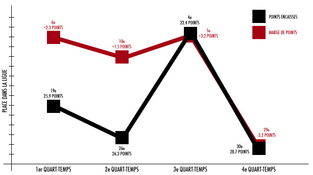 Ainsi, Houston marque 2.3 points de plus que ses adversaires dans le premier quart, 1.5 point dans le deuxième et 3.2 dans le troisième. Ça devrait leur permettre de faire la différence, sauf que leurs adversaires marquent également 3.2 points de plus qu’eux dans le quatrième quart-temps. Dans cette catégorie, ils sont 29e de la ligue. Seul Boston, qui a aussi tendance à s’écrouler en fin de match, fait pire !