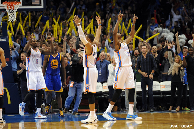 Certains matchs de saison régulière sont plus importants que d’autres. Et le Thunder avait probablement coché cette date de retrouvailles avec les Warriors depuis ce shoot assassin d’Andre Iguodala dans la Baie d’Oakland. De retour à domicile, le Thunder prenait le meilleur départ derrière un Russell Westbrook (14 points) étincelant. Le meneur commençait par un 5/5 aux tirs mais les Warriors ont du répondant.