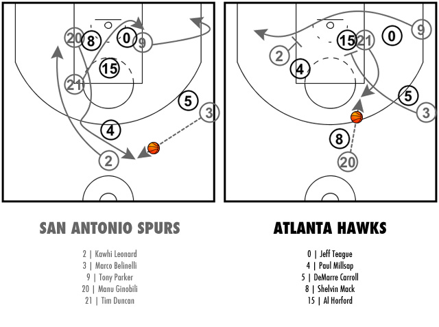 Alors que Marco Belinelli s’apprête à faire la remise en jeu, Manu Ginobili remonte au-delà de la ligne à trois points et croise Kawhi Leonard, qui descend. Tim Duncan se poste lui poste bas tandis que Tony Parker flotte le long de la ligne de fond. L’Italien donne alors la balle à l’Argentin et va poser son écran sur Paul Millsap, offrant à son intérieur l’espace suffisant, une fois servi, pour tirer en tête de raquette.