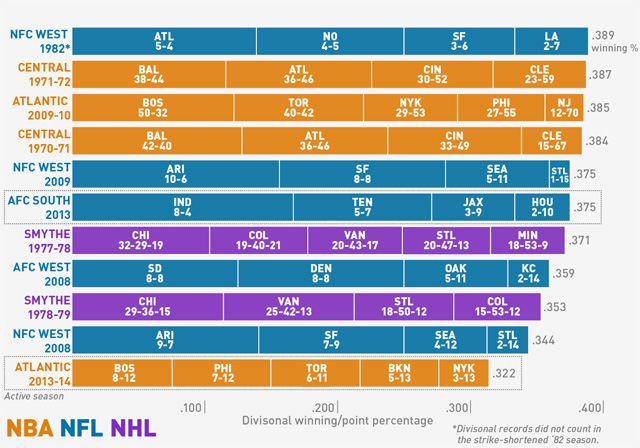 Nos confrères ont ainsi répertorié l’ensemble des résultats des divisions en NBA, NFL, MLB et NHL soit les ligues de basket, football américain, baseball et hockey sur glace. Et on n’avait jamais eu affaire à une telle médiocrité collective dans une seule et même division.