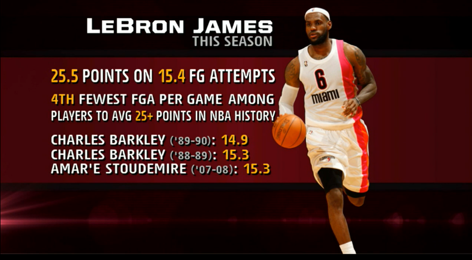 En l’occurrence, on s’est aperçu que LeBron James était en train de réaliser sa meilleure saison en termes d’efficacité. Ecrémant déjà largement son jeu l’an passé avec un pourcentage carrément indécent de 56,5% de réussite aux tirs, le King du Heat parvient encore à faire mieux.